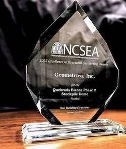 Geometrica was recognized as a finalist in the Non-Building Structures category at the 2025 Structural Engineering Excellence (SEE) Awards, organized by the National Council of Structural Engineers Associations (NCSEA). The distinction acknowledges our engineering work on the Quebrada Blanca Phase 2 Stockpile Dome Project, featuring the proprietary Hoisting Tower system, designed to enable efficient, rapid, and safe installation of large domes and long-span covers.